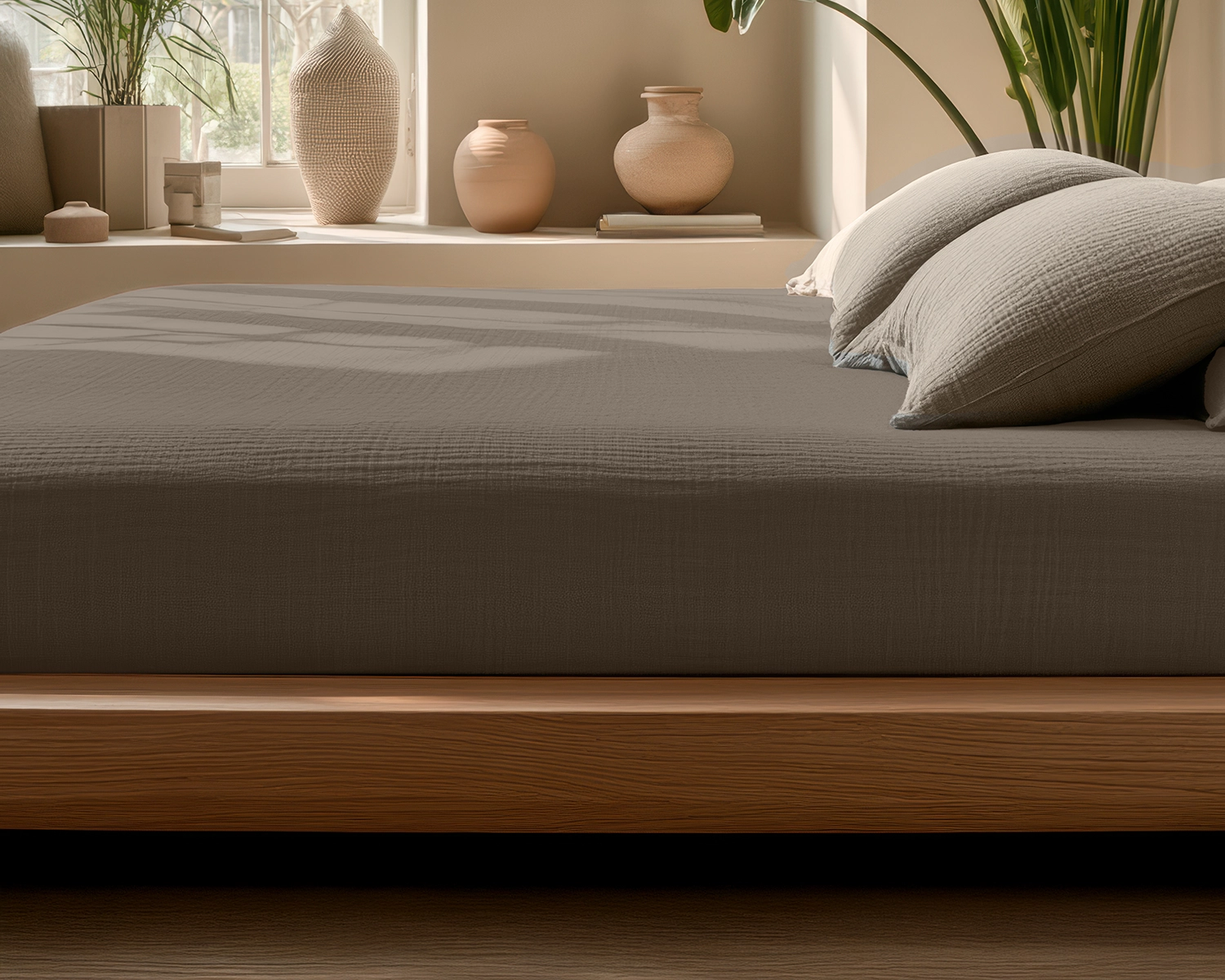 Het taupe mousseline hoeslaken van Dreamhouse is gemaakt van heerlijk zacht 100% katoen. De speciale techniek die gebruikt wordt bij de mousseline hoeslakens zorgt ervoor dat het katoen een gekreukte structuur krijgt. Door de elastieken randen doe je dit hoeslaken makkelijk om je matras en blijft het goed zitten.