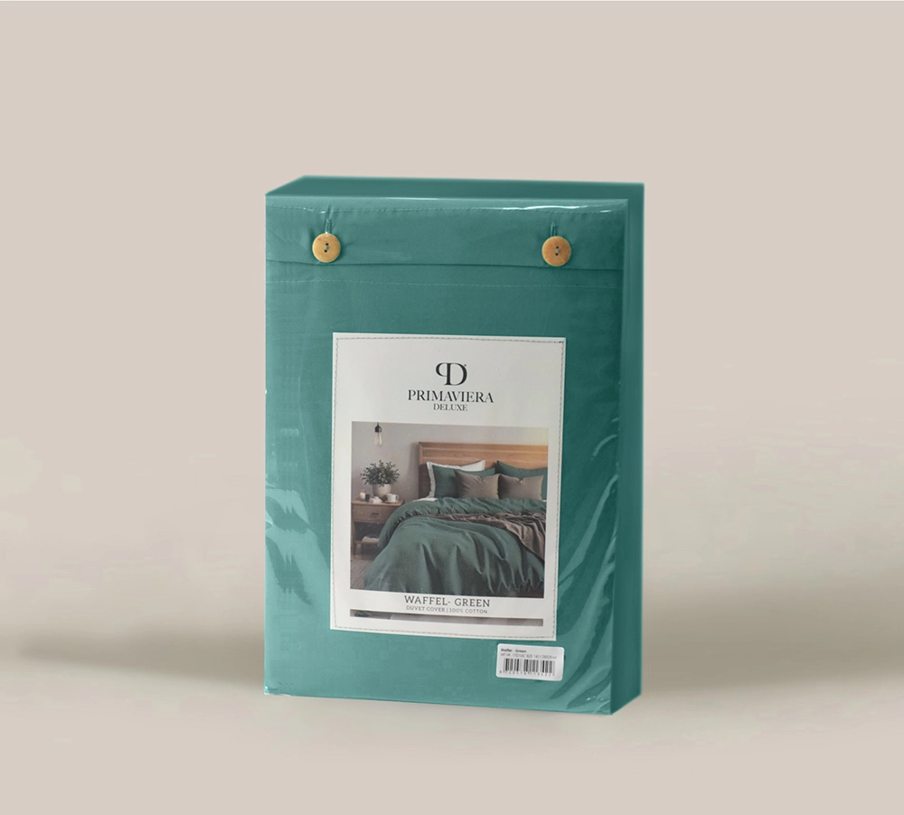 Het Waffle dekbedovertrek van Primaviera Deluxe voelt heerlijk zacht aan en zorgt voor optimaal comfort. Het prachtige percal katoen dekbedovertrek heeft een effen groene kleur met wafel structuur aan de bovenzijde. Je waant je in luxe hotel wanneer je je slaapkamer binnenstapt en naar het opgemaakte bed kijkt. De kussenslopen hebben een strook wafel patroon.