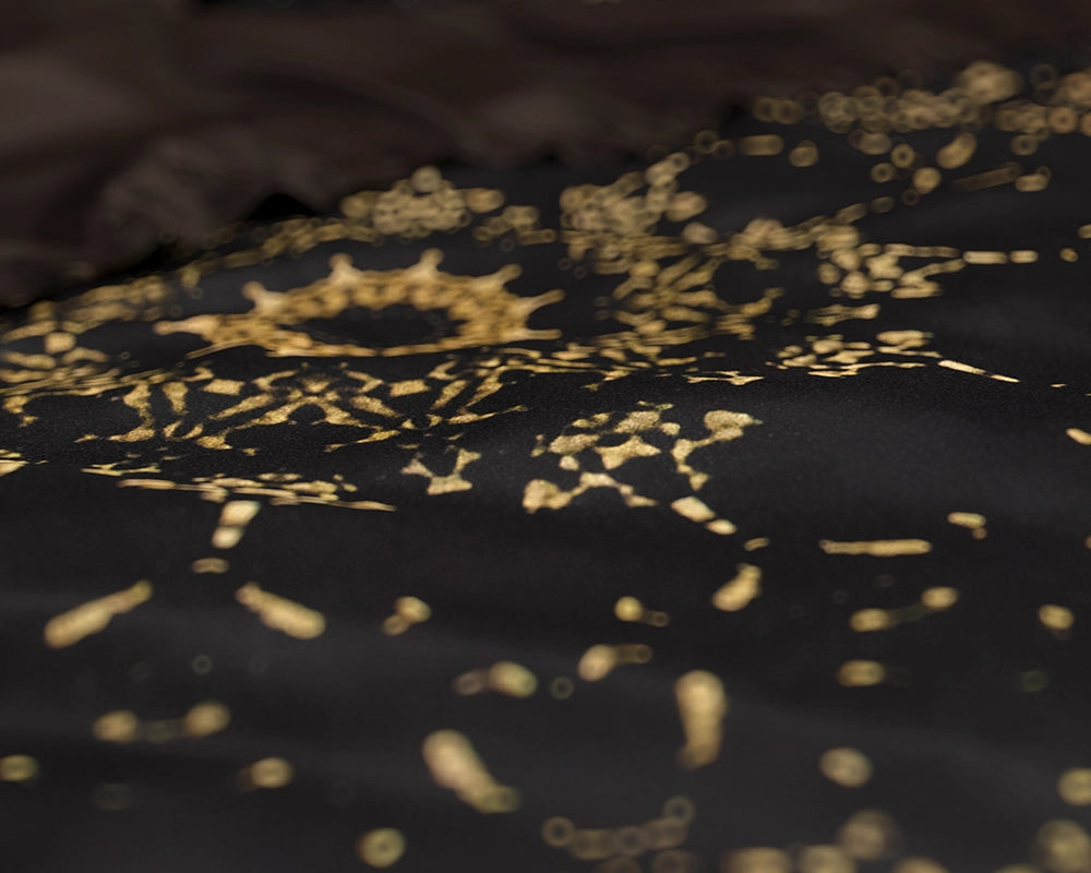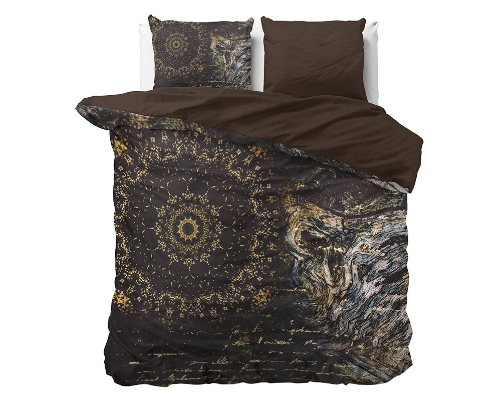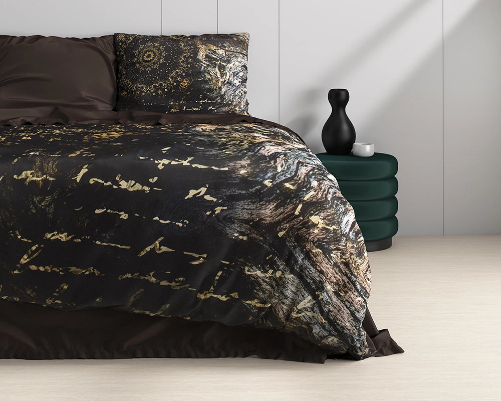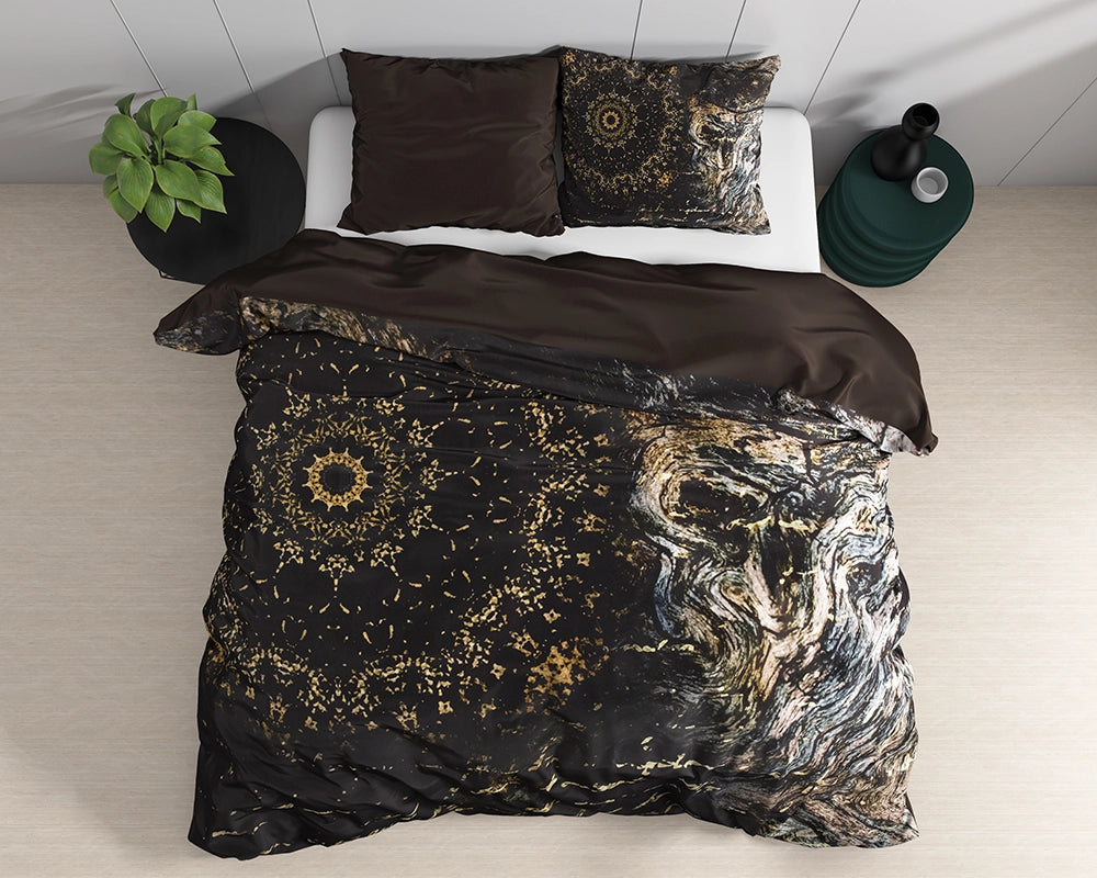 Het dekbedovertrek Romero van Dreamhouse voegt patroon en luxe aan je slaapkamer toe. Met een diepe bruine kleur en gouden details krijgt het een chic tintje. De prachtige motieven, kalligrafie en het marble effect trekken de aandacht. De achterkant heeft een effen kleur en is niet bedrukt. Romero maakt deel uit van de WILD collectie van Dreamhouse, die meer van dit soort unieke prints bevat.