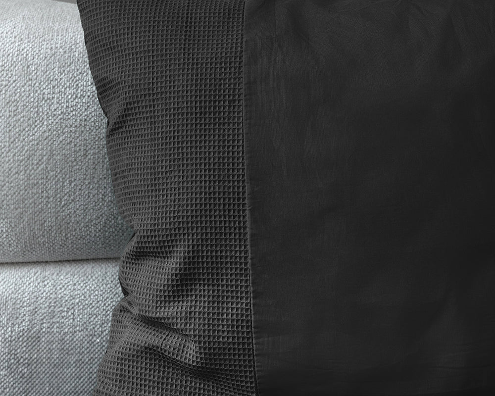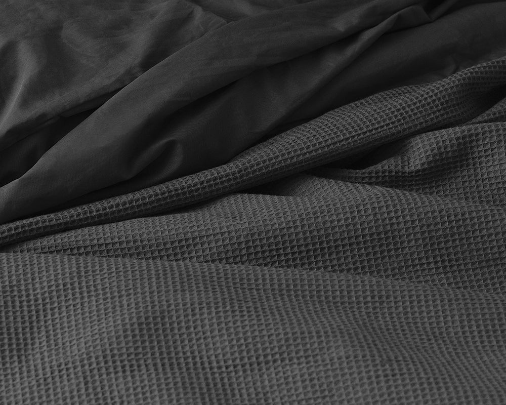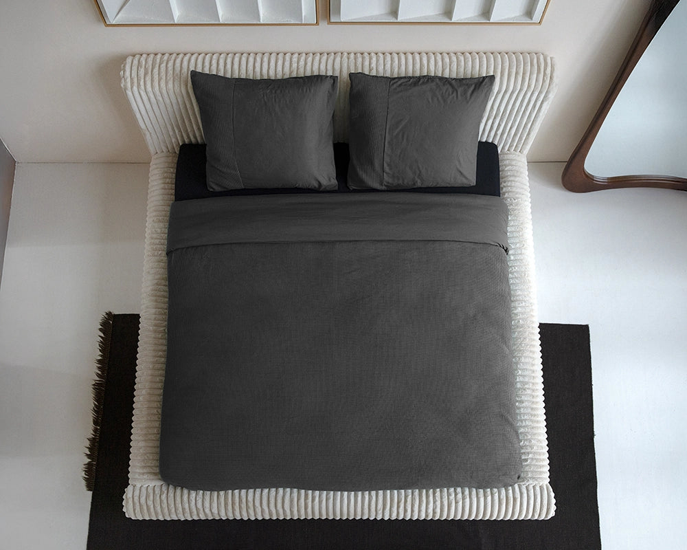 Het Waffle dekbedovertrek van Primaviera Deluxe voelt heerlijk zacht aan en zorgt voor optimaal comfort. Het prachtige percal katoen dekbedovertrek heeft een effen antraciet kleur met wafel structuur aan de bovenzijde. Je waant je in luxe hotel wanneer je je slaapkamer binnenstapt en naar het opgemaakte bed kijkt. De kussenslopen hebben een strook wafel patroon.