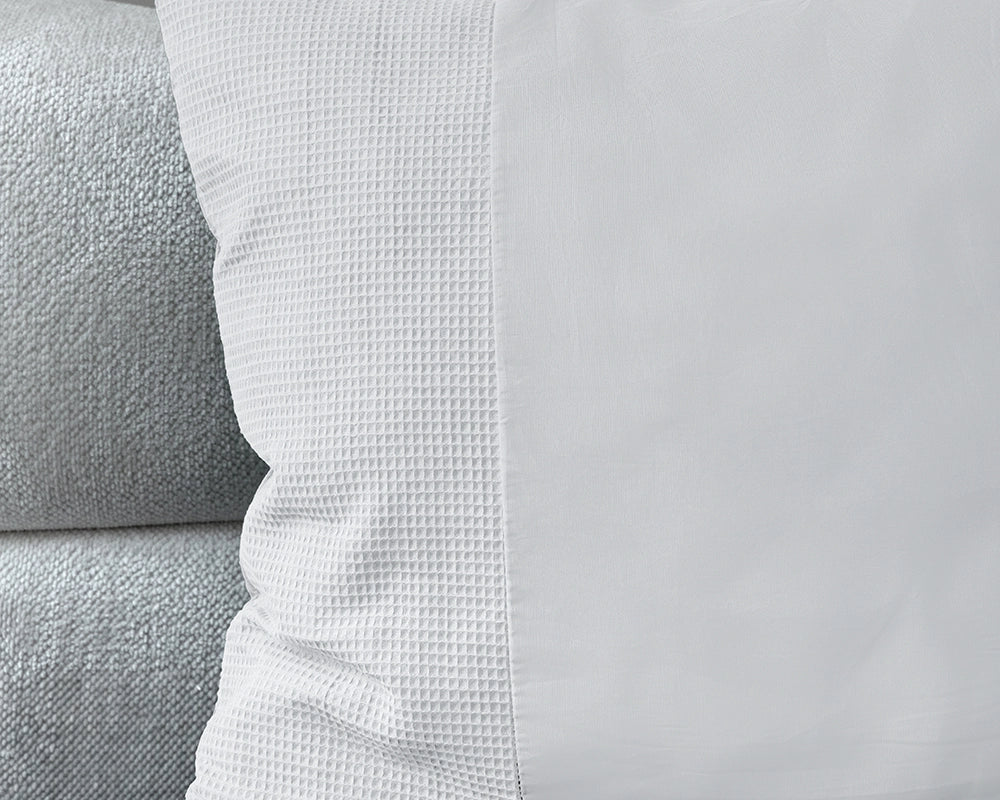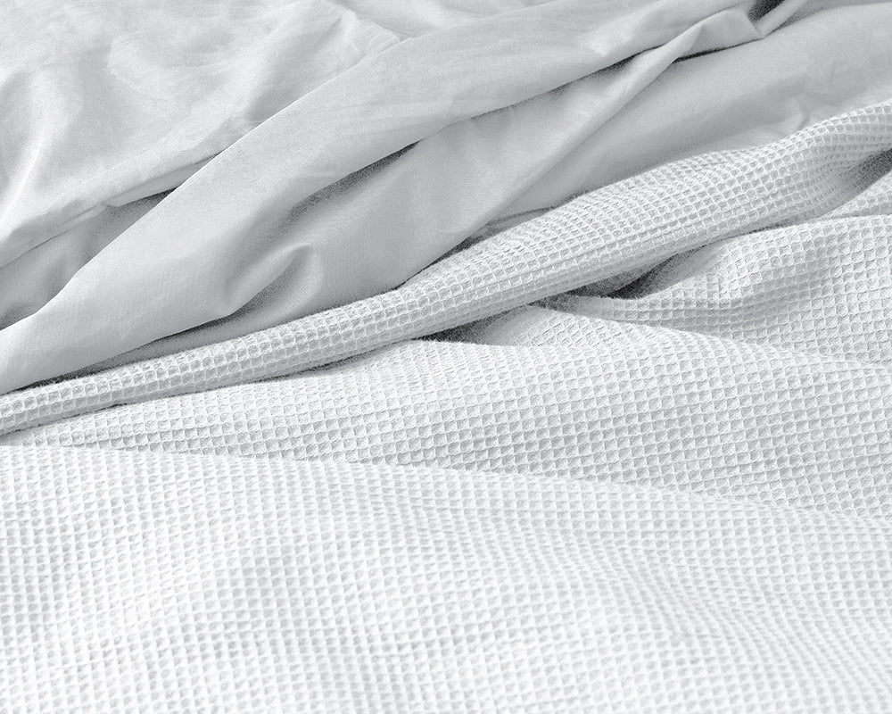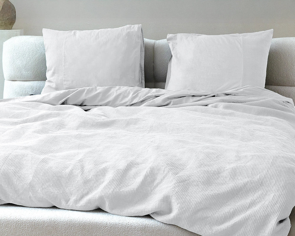 Het Waffle dekbedovertrek van Primaviera Deluxe voelt heerlijk zacht aan en zorgt voor optimaal comfort. Het prachtige percal katoen dekbedovertrek heeft een effen witte kleur met wafel structuur aan de bovenzijde. Je waant je in luxe hotel wanneer je je slaapkamer binnenstapt en naar het opgemaakte bed kijkt. De kussenslopen hebben een strook wafel patroon.