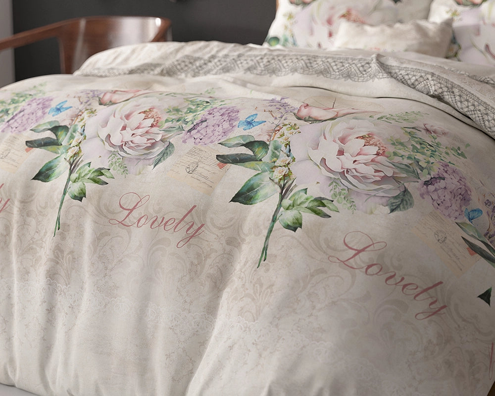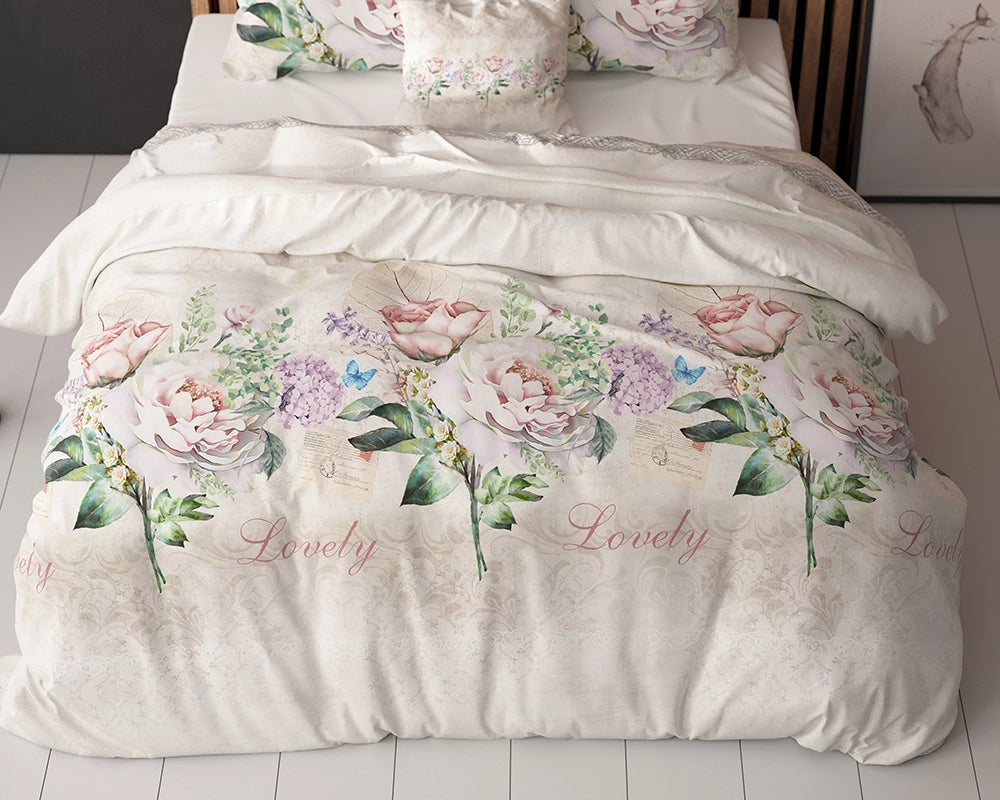 Laat je slaapkamer weer nieuw en verlicht voelen met het dekbedovertrek Lovely Flower van Sleeptime. De beige basis is perfect voor het mooie herhalende print. Met stiekeme beige tinten die vol met een krullend motief staan heb je een soort ‘banner’ op de boven- en onderkant van het dekbedovertrek. De bloemenboeketten die je aandacht trekken bevatten prachtige details, van verschillende soorten bloemen tot vlinders en de skeletten van bladeren. Met kleuren van groen, paars, blauw en roze springen deze details er goed uit en laten ze je ogen dwalen. Een leuk detail is de briefkaart die bij het boeket is afgebeeld, de stempel en handgeschreven notitie geven iets extra’s. Het dekbedovertrek wordt afgemaakt door een herhalend woord, namelijk Lovely. Hopelijk is ligger onder dit dekbedovertrek net zo Lovely als dat het eruit ziet!