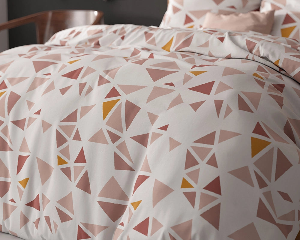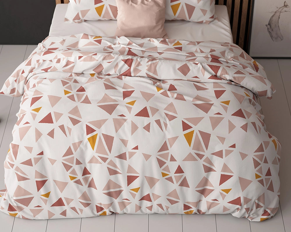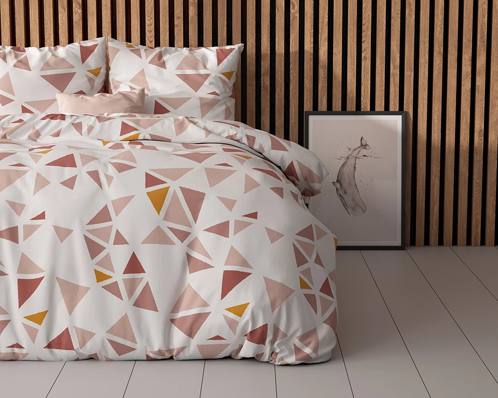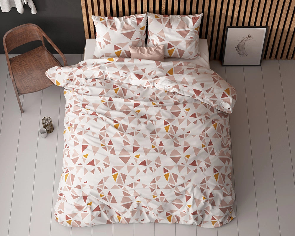 Zoek jij een simpel maar toch kleurrijk dekbedovertrek? Dan is het dekbedovertrek Bella van Sleeptime een goede optie! Dit dekbedovertrek heeft een witte basis, wat toevoegt aan de ontspanning van je slaapkamer, en kan toch een leuke boost aan kleur geven met het design. Tinten van roze en oranje springen over het dekbedovertrek en kunnen gemakkelijk wat fleurigs toevoegen aan je slaapkamer. Het design van driehoekjes straalt zowel rust als iets speels uit en laat je toch een tweede blik werpen op je heerlijk zachte bed!
