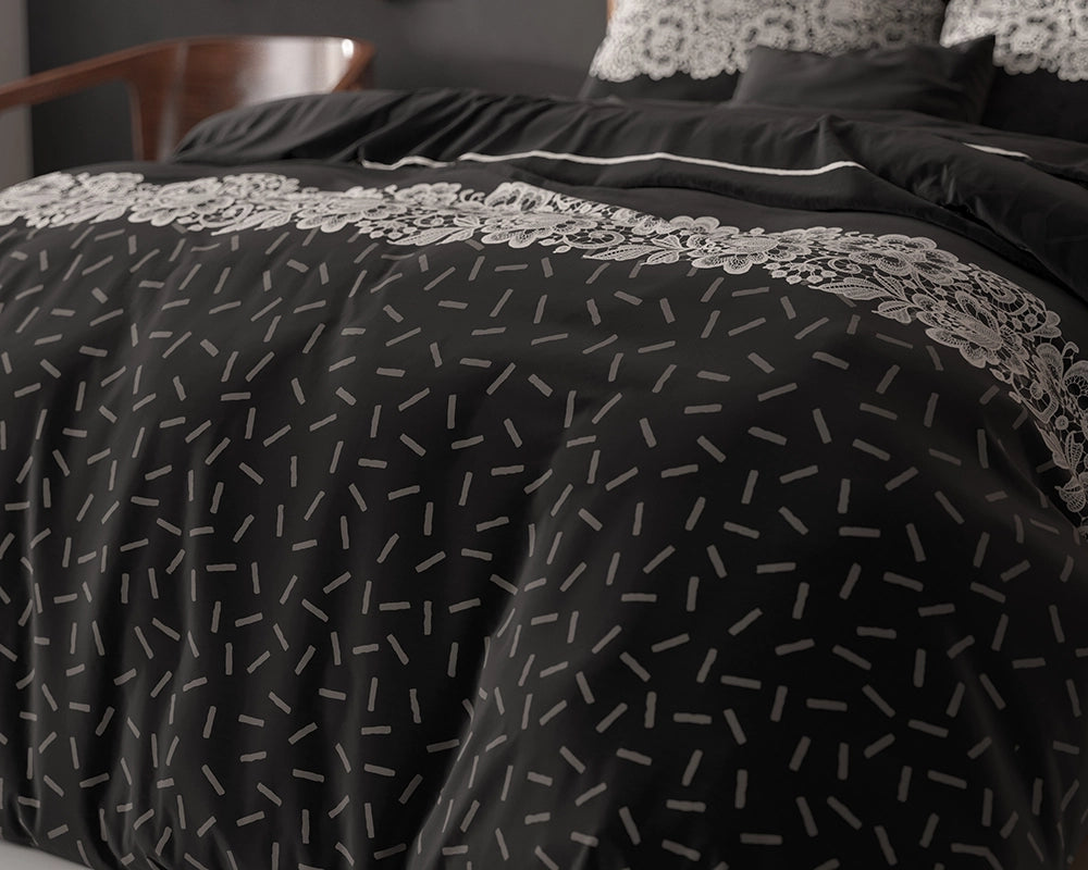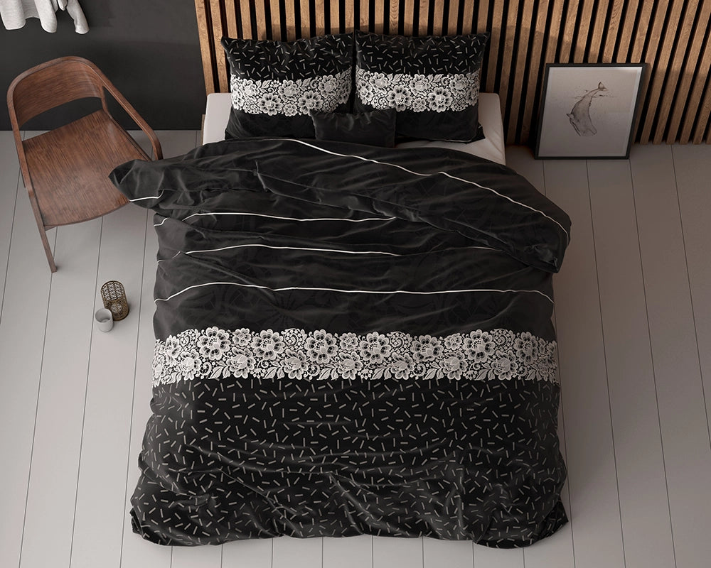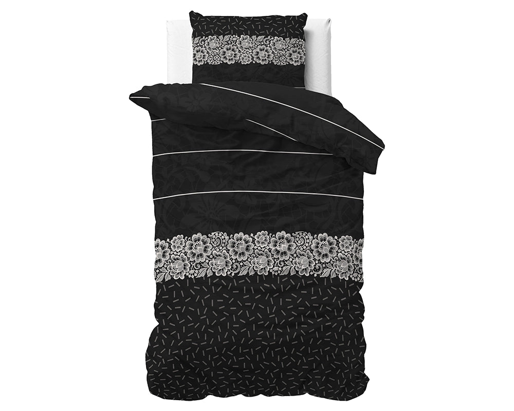 Het dekbedovertrek Dervio zit vol design en is toch gemakkelijk te combineren in je slaapkamer! Het design bestaat eigenlijk uit drie verschillende motieven die prachtig samenkomen in het dekbedovertrek. De zwarte kleur blijft de basis maar wordt af en toe geaccentueerd met witte en grijze tinten. De bovenkant van het dekbedovertrek heeft een leuk en gedetailleerd patroon in het grijs, met witte lijnen die er horizontaal over heen lopen. Het gebruik van de kleuren zorgt voor een diepte in het design en trekt je ogen om naar je heerlijke bed te kijken! In het midden wordt het design een beetje onderbroken door een mooi bloemen motief, wat als een soort band over het dekbedovertrek ligt. De onderkant heeft een ‘hagelslag’ patroon en voegt nog wat speels toe aan het geheel. Alle drie de designs komen samen in Dervio en geven je bed een volledig nieuwe look!