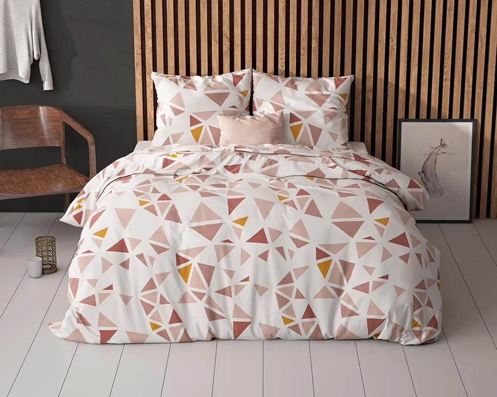Zoek jij een simpel maar toch kleurrijk dekbedovertrek? Dan is het dekbedovertrek Bella van Sleeptime een goede optie! Dit dekbedovertrek heeft een witte basis, wat toevoegt aan de ontspanning van je slaapkamer, en kan toch een leuke boost aan kleur geven met het design. Tinten van roze en oranje springen over het dekbedovertrek en kunnen gemakkelijk wat fleurigs toevoegen aan je slaapkamer. Het design van driehoekjes straalt zowel rust als iets speels uit en laat je toch een tweede blik werpen op je heerlijk zachte bed!
