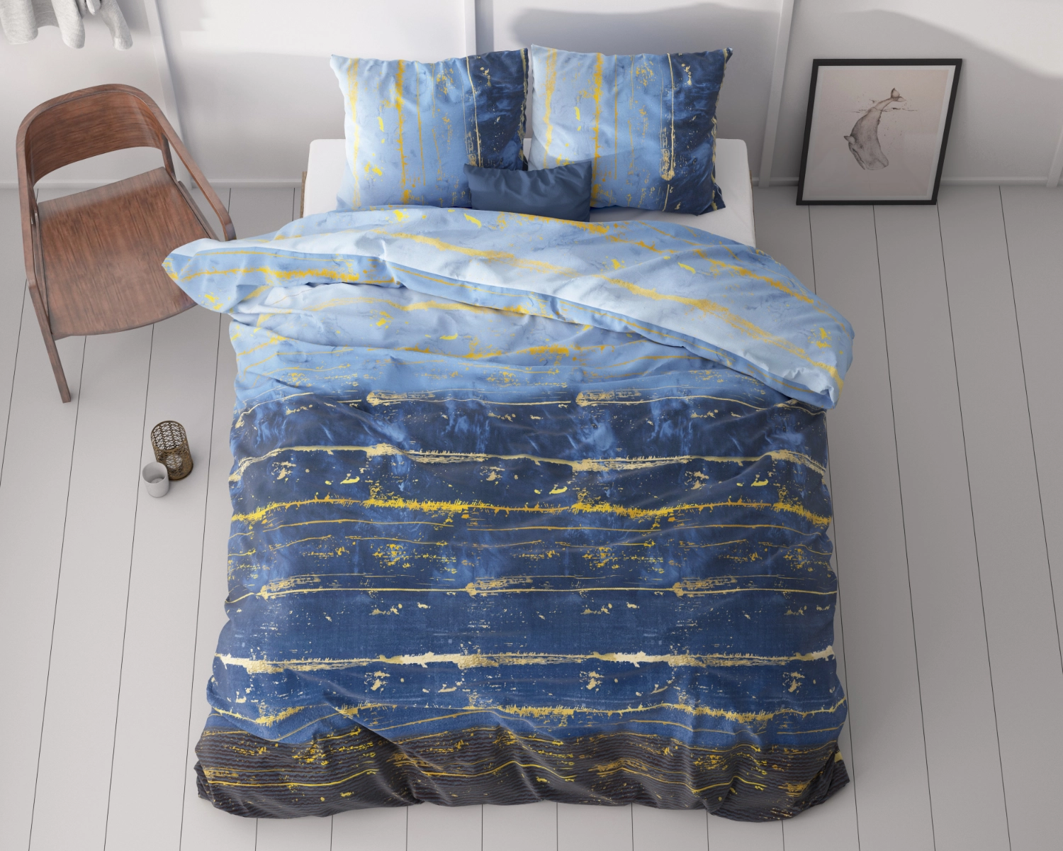 Het ombre design van het dekbedovertrek Scratchy geeft een mix van zowel een donkere kleur als een lichte kleur in je slaapkamer. Zo hoef je niet te kiezen en kun je beide aspecten toevoegen aan je bed. De onderkant is donker en heeft een bijna zwarte achtergrond, terwijl verder naar boven de achtergrond langzaam lichter wordt en afsluit met een blauwe kleur. Gestreept met gouden lijnen krijgt het dekbedovertrek een vleugje luxe. Zo kan in je eigen bed kruipen een gevoel van ontspanning en verwenning geven!